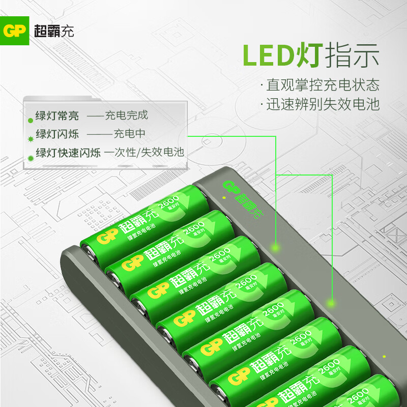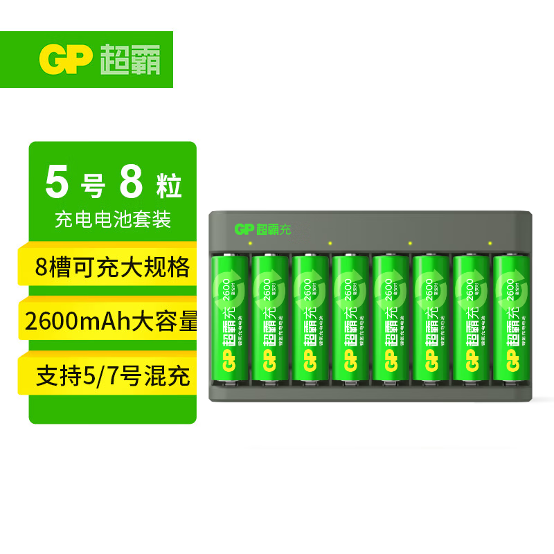 超霸(GP)5号8粒充电电池套装含2600mAh号8粒+充电器8槽可充
